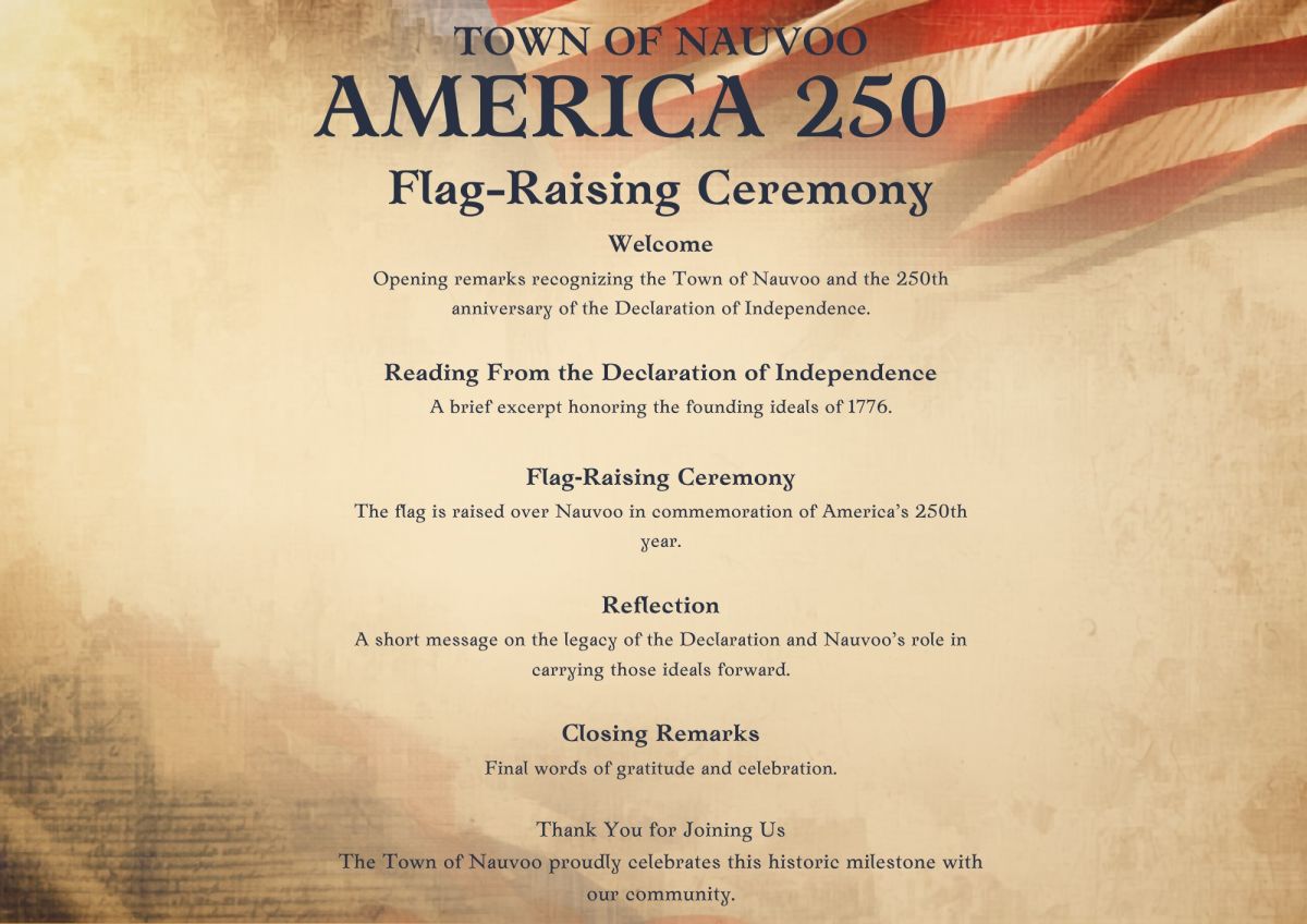 Join us for the America250AL Flag Raising Ceremony that will be held directly after the Car Show Winners are announced (around noon). The Flag raising ceremony will take place at the Nauvoo Town Hall.